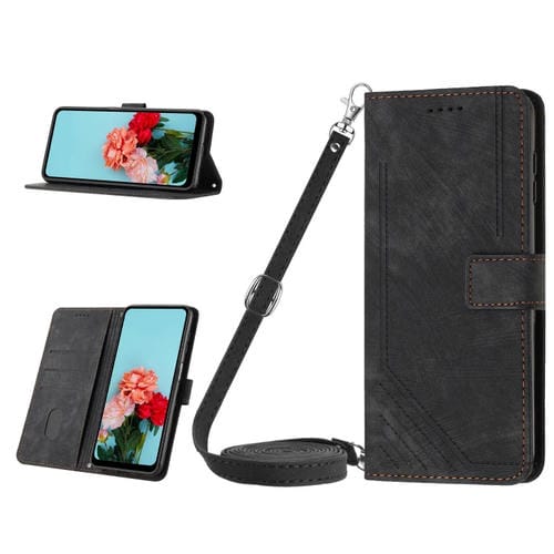 Funda de Cuero para Motorola Moto G14 con Patrón de Rayas y Cordón (Negro)