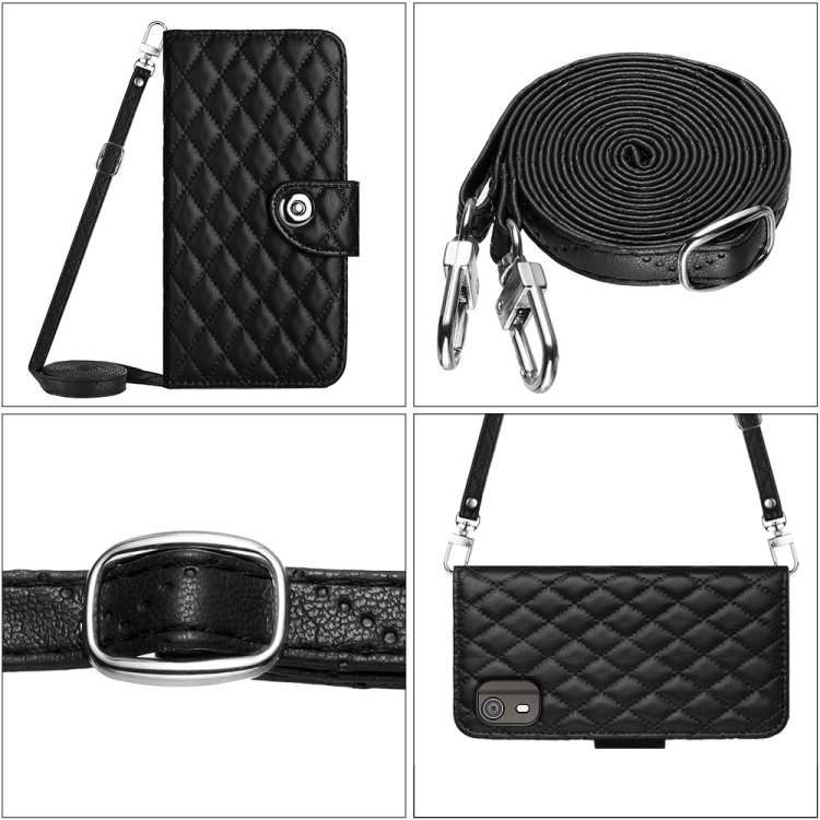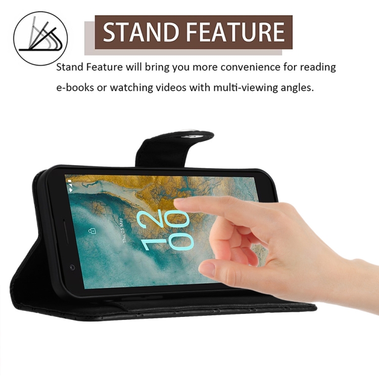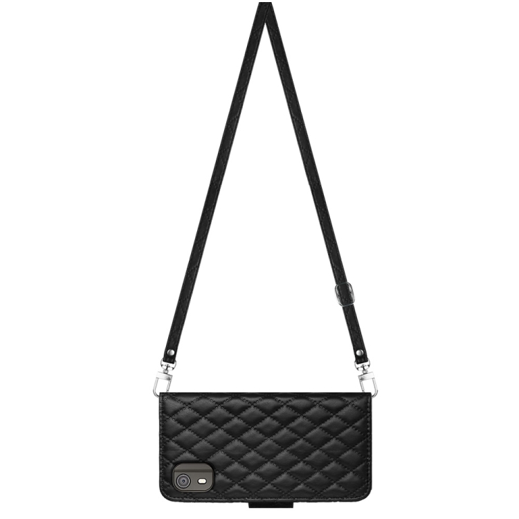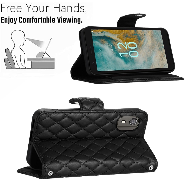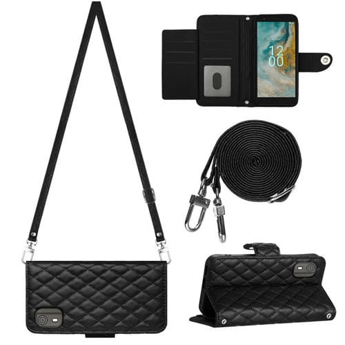 Funda para Nokia C02 de Cuero con Tapa, Textura Rómbica y Cordón Largo (Negro)