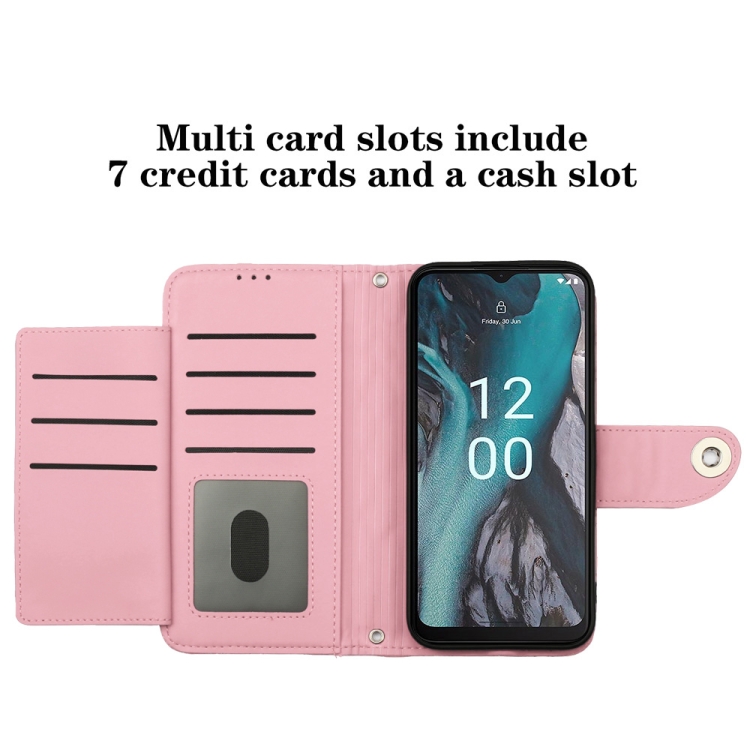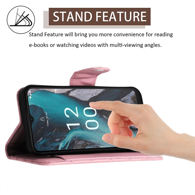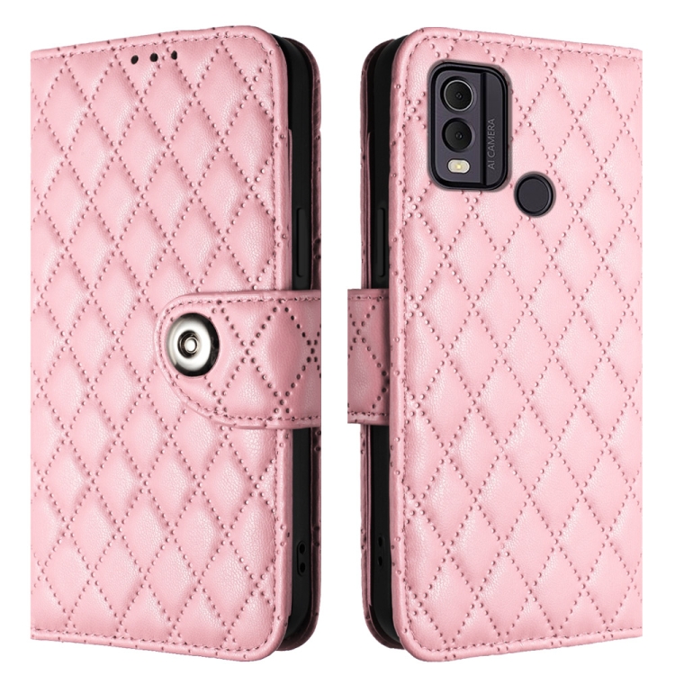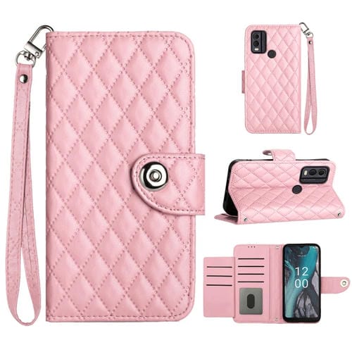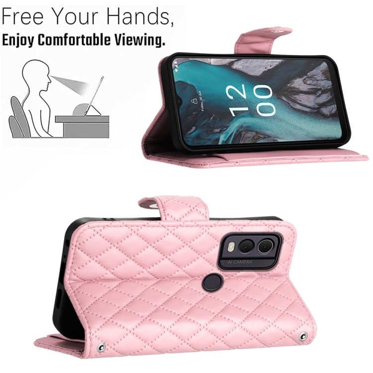 Funda para Nokia C22 de Cuero con Tapa, Textura Rómbica y Cordón (Rosa)