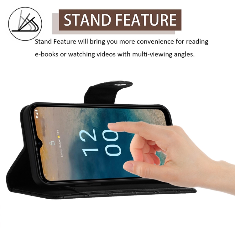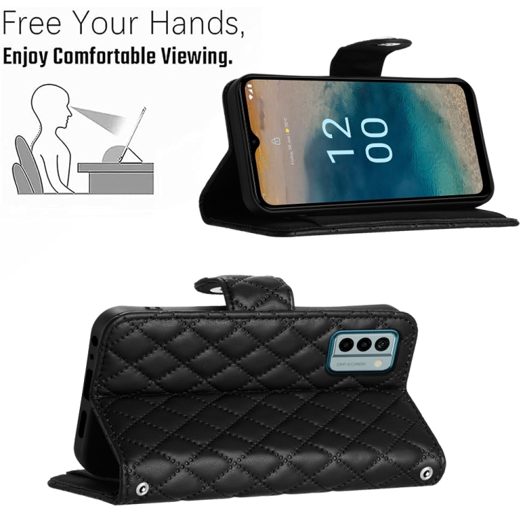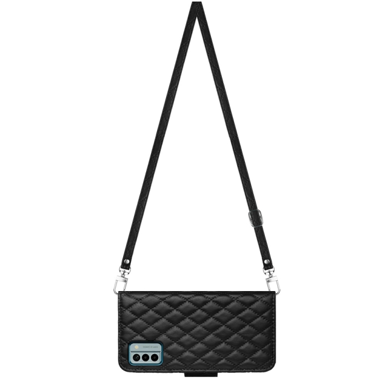 Funda de Cuero para Nokia G22 con Tapa Textura Rómbica y Cordón Largo (Negro)