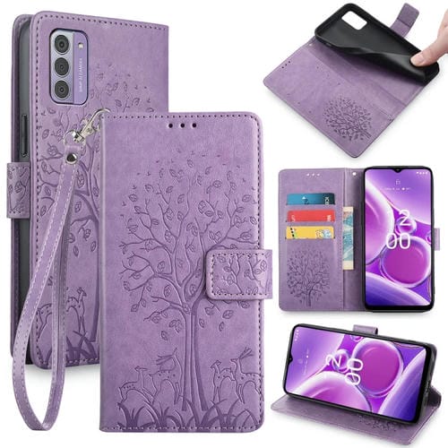 Funda para Teléfono Nokia G42 5G de Cuero con Relieve Árbol y Ciervo (Púrpura)