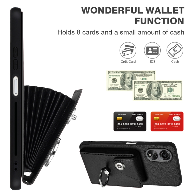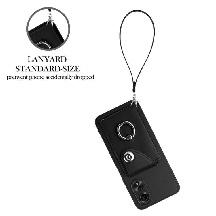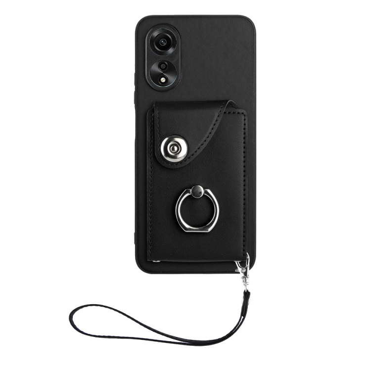 Para Oppo A38 4G / A18 4G Bolsa de Tarjeta de Órgano Global Soporte de Anillo Funda para Teléfono de Pu con Cordón (Negro)