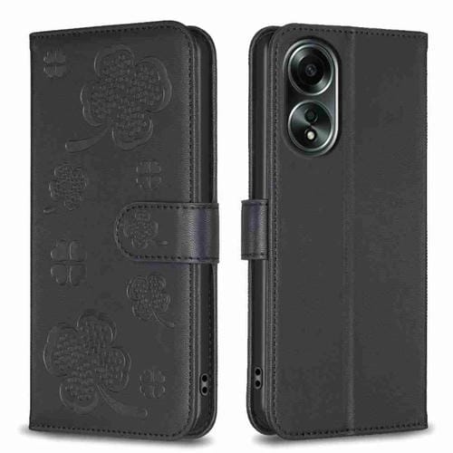 Para Oppo A58 4G Funda de Cuero con Relieve de Cuatro Hojas (Negro)