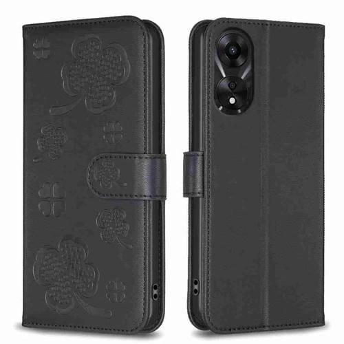 Para Oppo A78 5G Funda de Cuero con Relieve de Cuatro Hojas (Negro)