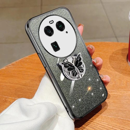 Para Oppo Find X6 Funda para Teléfono de TPU con Soporte de Mariposa con Brillo Degradado Plateado (Negro)