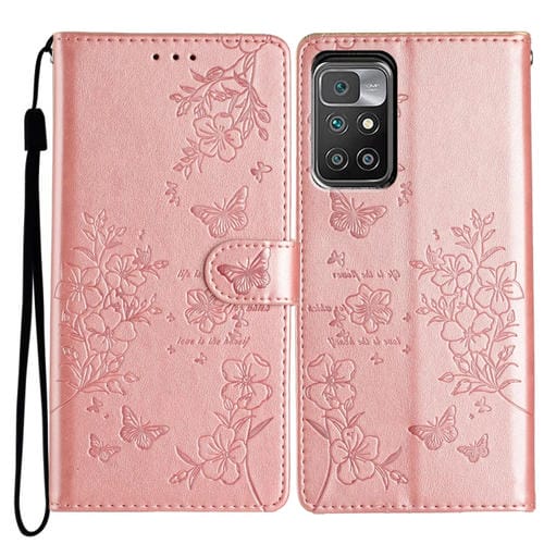 Para Redmi 10 Funda de Cuero para Teléfono con Mariposas y Flores (Oro Rosa)