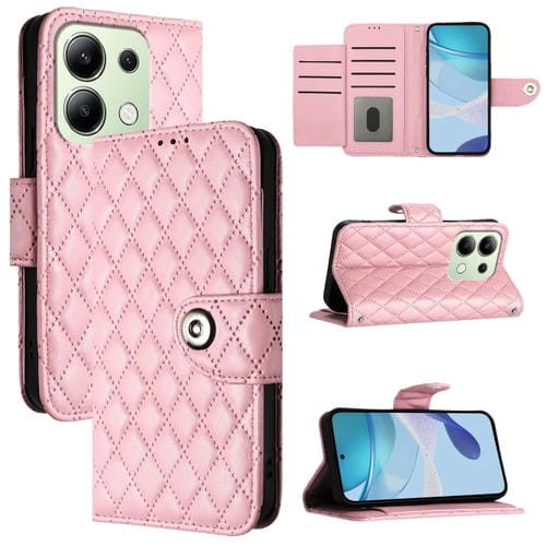 Para Redmi Note 13 4G Global Rhombic Texture Funda de Cuero con Tapa para Teléfono con Cordón (Rosa)