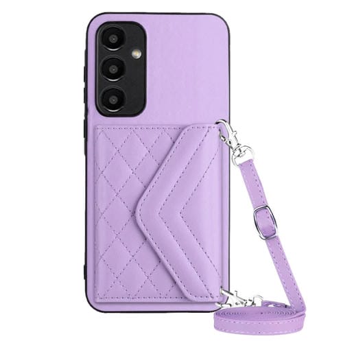 Estuche para Teléfono Samsung Galaxy A35 Rfid con Bolsa para Tarjetas Textura Rómbica y Cordón Largo (Púrpura Claro)