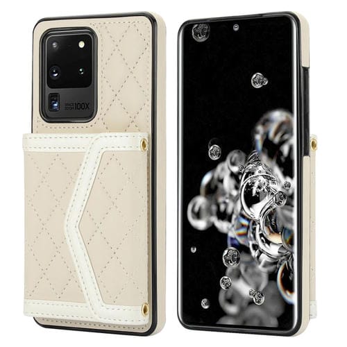 Estuche para Teléfono Samsung Galaxy S20 Ultra Empalme con Textura Rómbica y Bolsa para Tarjetas con Cordón Largo (Beige)