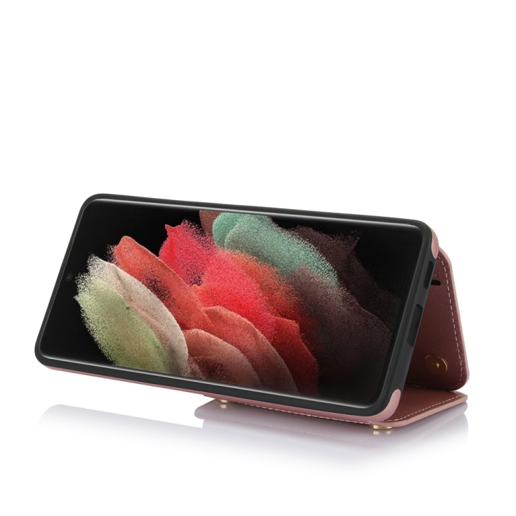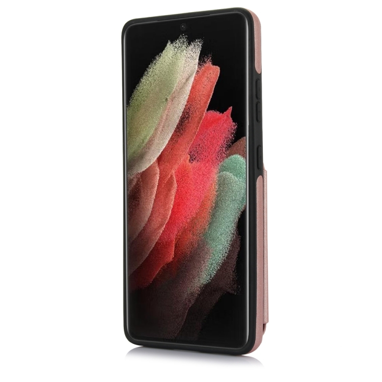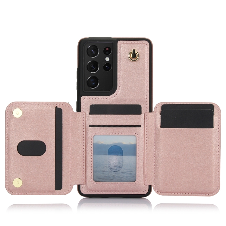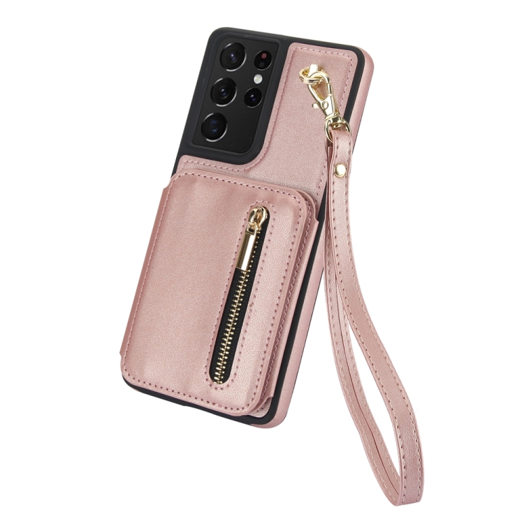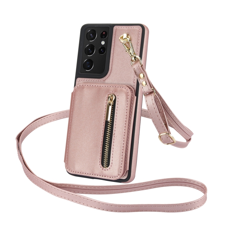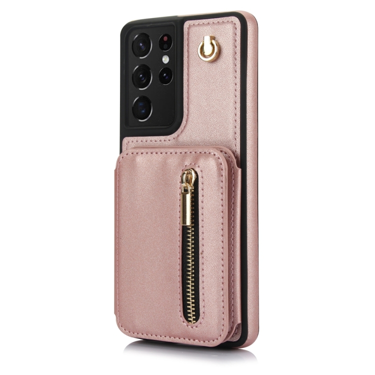 Estuche para teléfono Samsung Galaxy S21 Ultra 5G Ym006 con bolsa para tarjetas con cremallera y sensación de piel con cordón doble (Oro Rosa)