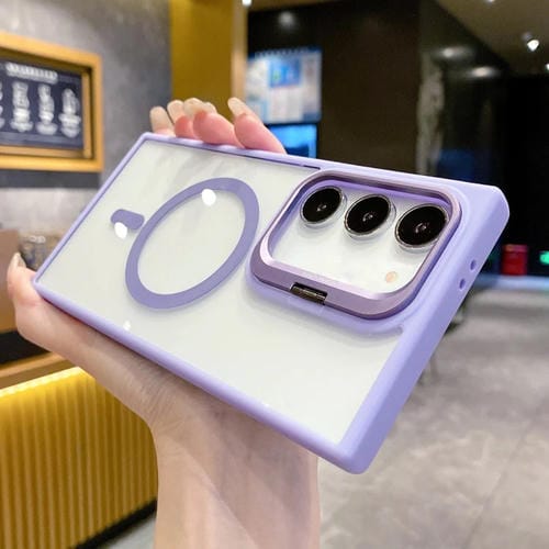 Estuche para teléfono Samsung Galaxy S23 5G Magsafe con soporte y marco de lente de metal (Púrpura)