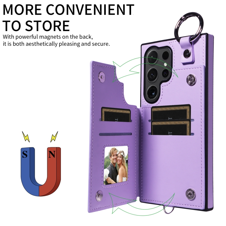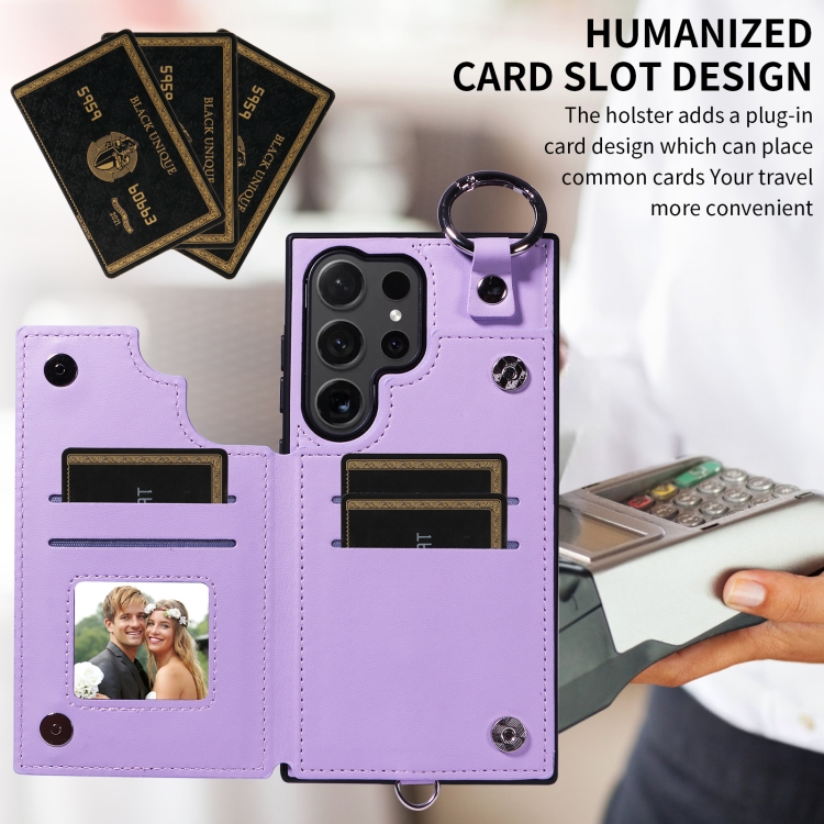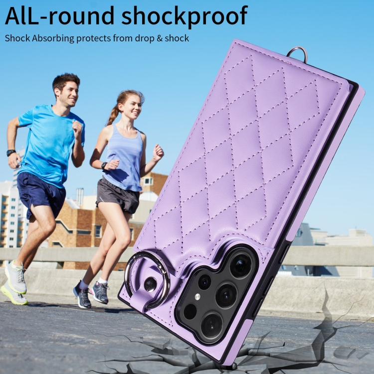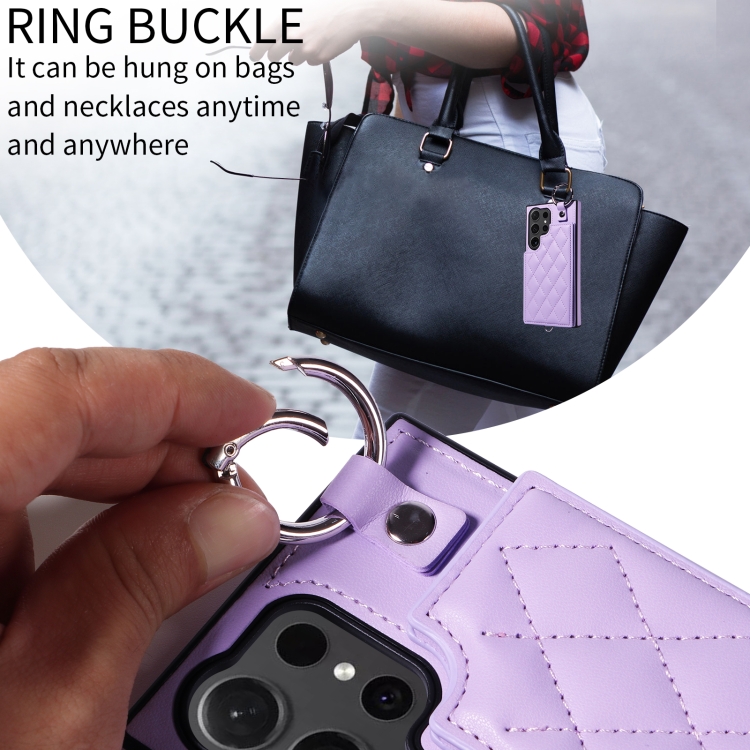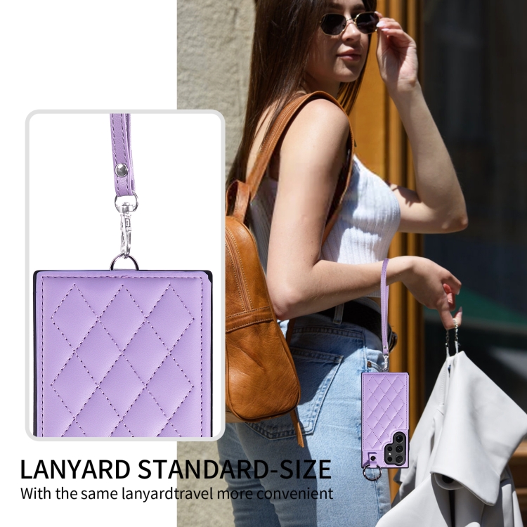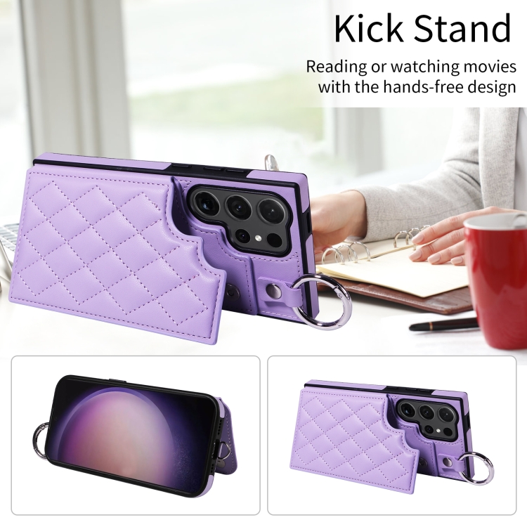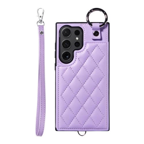 Estuche para Teléfono Samsung Galaxy S24 Ultra 5G con Bolsa para Tarjetas Textura Rómbica y Cordón Corto (Púrpura)