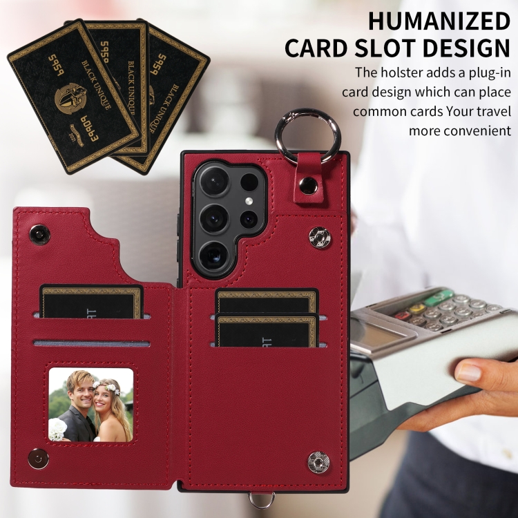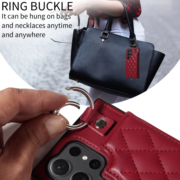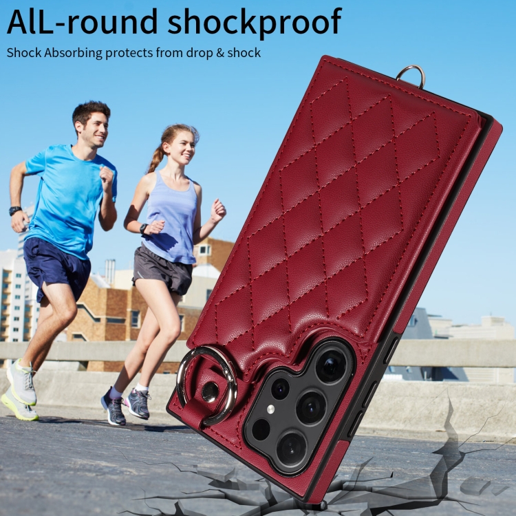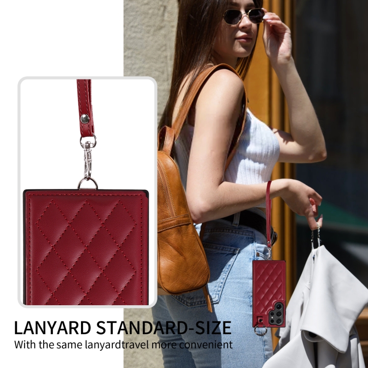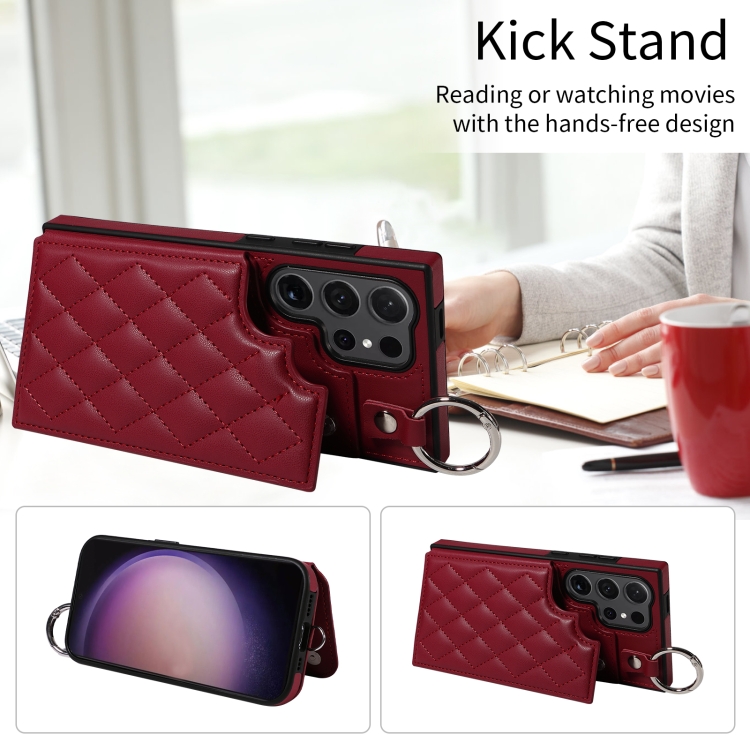 Estuche para Teléfono Samsung Galaxy S24 Ultra 5G con Bolsa para Tarjetas Textura Rómbica y Cordón Corto (Rojo Vino)