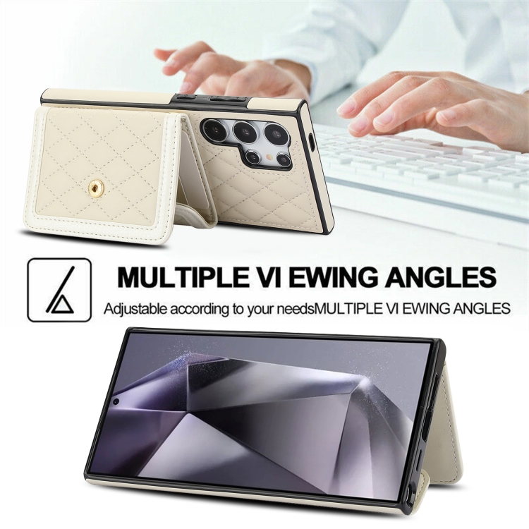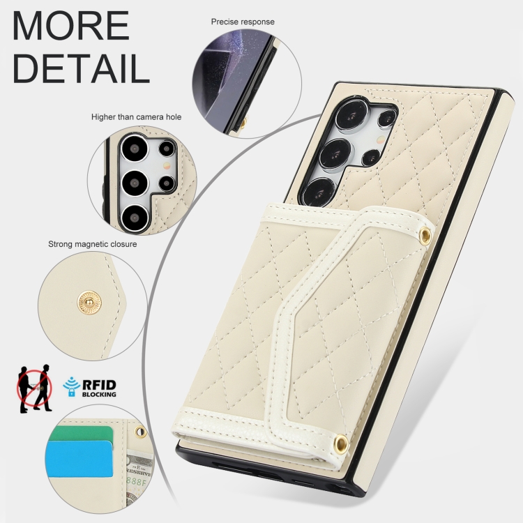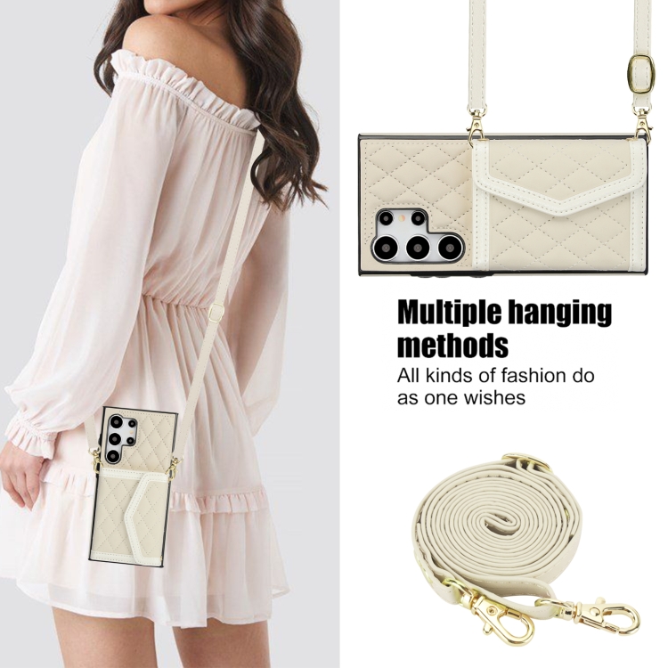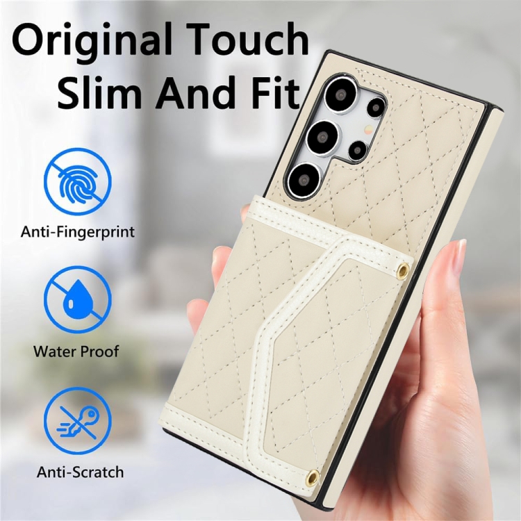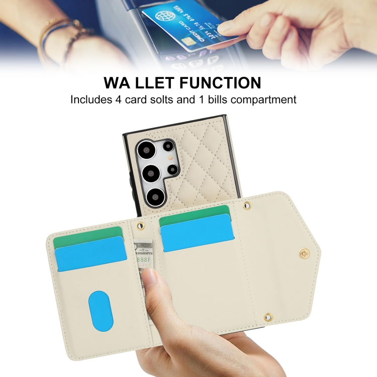 Estuche para Teléfono Samsung Galaxy S24 Ultra 5G con Bolsa para Tarjetas Textura Rómbica Empalme y Cordón Largo (Beige)