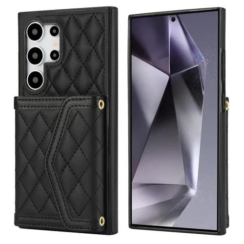 Estuche para Teléfono Samsung Galaxy S24 Ultra 5G con Bolsa para Tarjetas Textura Rómbica y Cordón Largo (Negro)