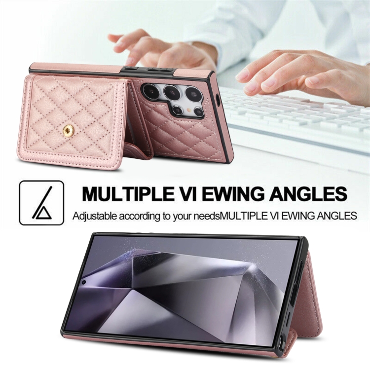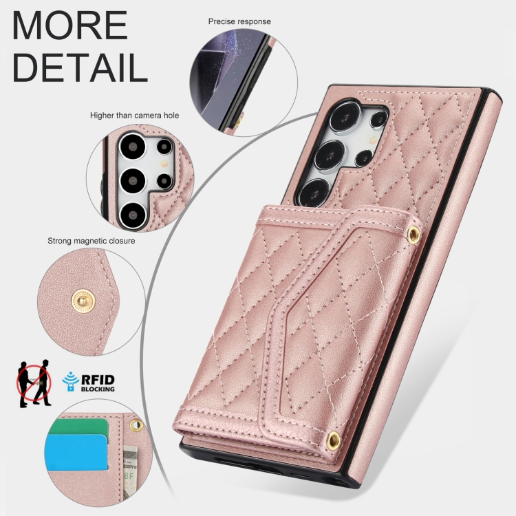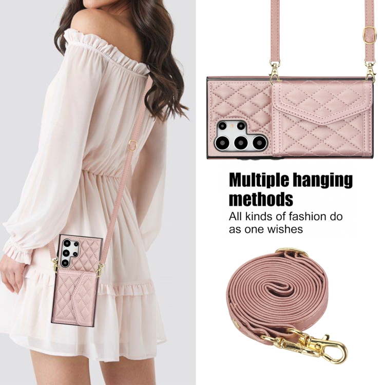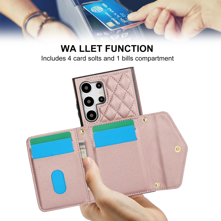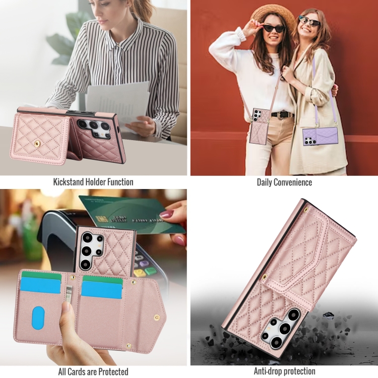 Estuche para Teléfono Samsung Galaxy S24 Ultra 5G con Bolsa para Tarjetas Textura Rómbica Empalme y Cordón Largo (Oro Rosa)