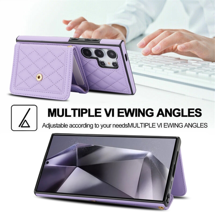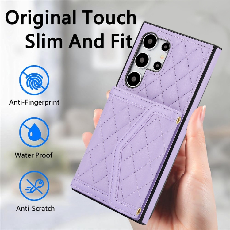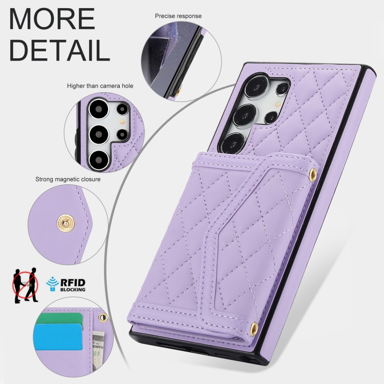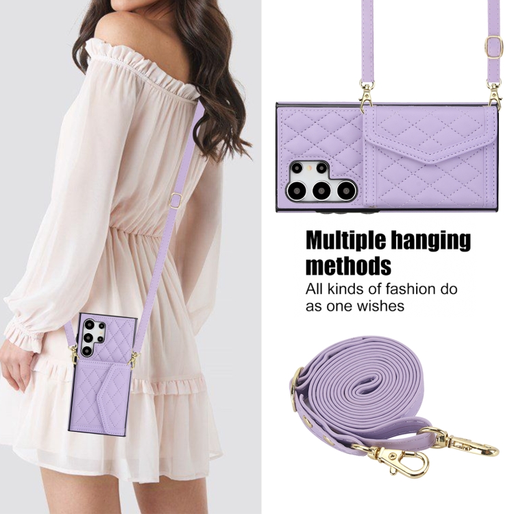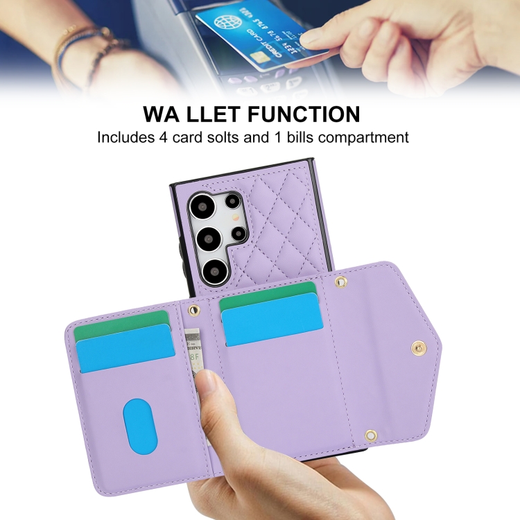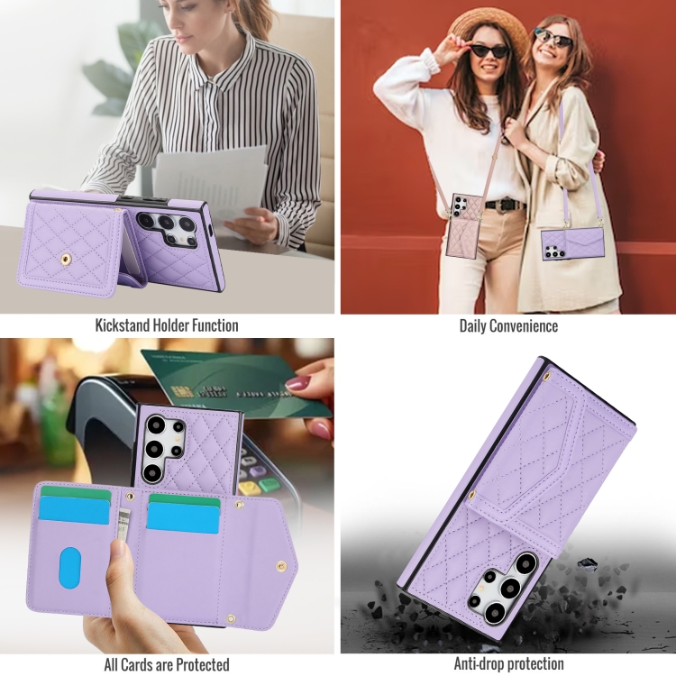 Estuche para Teléfono Samsung Galaxy S24 Ultra 5G con Bolsa para Tarjetas Textura Rómbica y Cordón Largo (Púrpura)