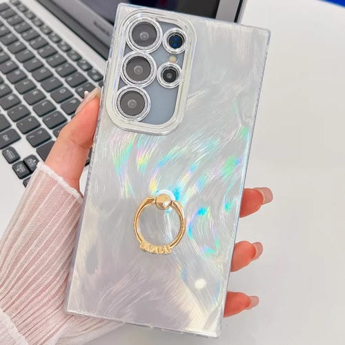 Estuche para Teléfono Samsung Galaxy S24 Ultra 5G con Soporte para Anillo Textura Brillante Revestimiento TPU Película para Lentes (Hilo de Plumas Blancas)