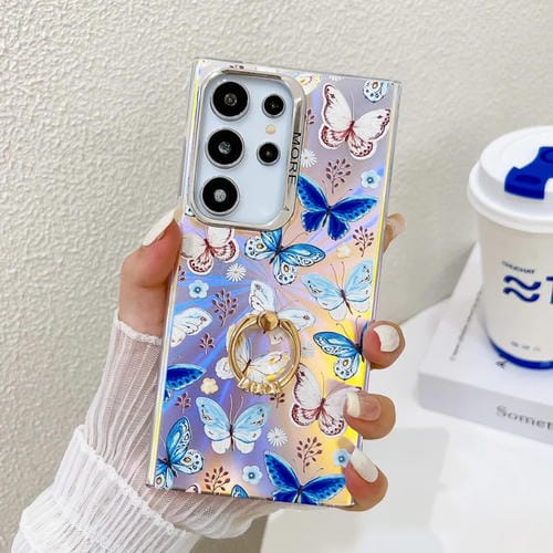 Estuche para teléfono Samsung Galaxy S24 Ultra 5G con soporte anillo mariposa láser galvanoplastia (Azul)