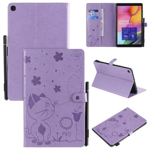 Funda protectora para tablet Samsung Galaxy Tab A9.7 T550 Cat Bee patrón relieve mesa a prueba de golpes con tapa horizontal soporte ranuras tarjetas billetera bolígrafo función despertador (Púrpura)