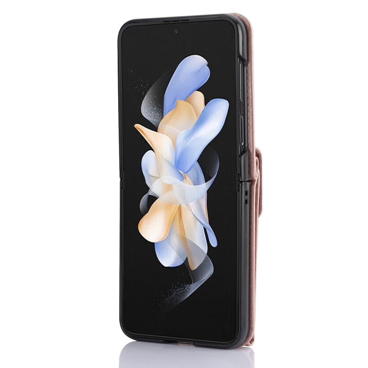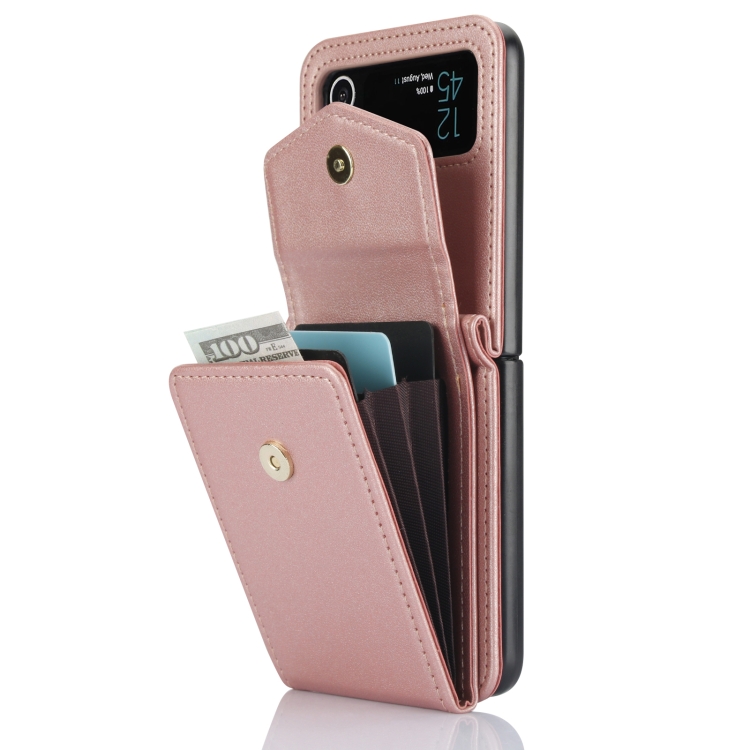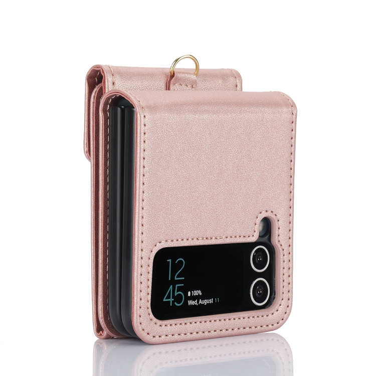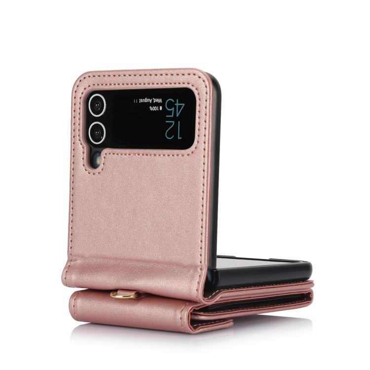 Estuche plegable para teléfono Samsung Galaxy Z Flip4 con RFID ranuras para tarjetas y cordón largo (Oro Rosa)