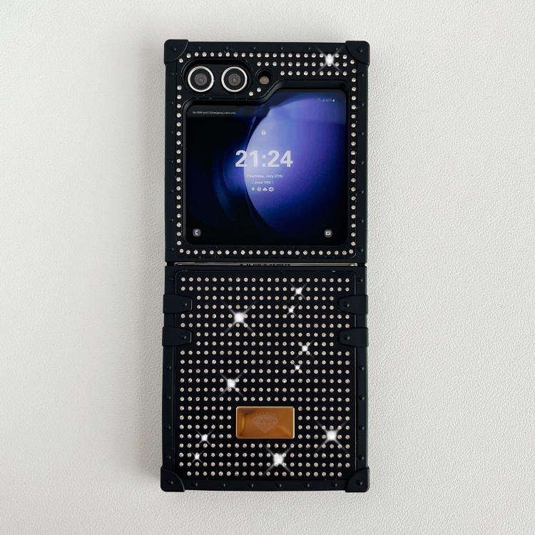 Estuche para teléfono Samsung Galaxy Z Flip5 5G PC a prueba de golpes con diamante completo y logotipo (Negro)