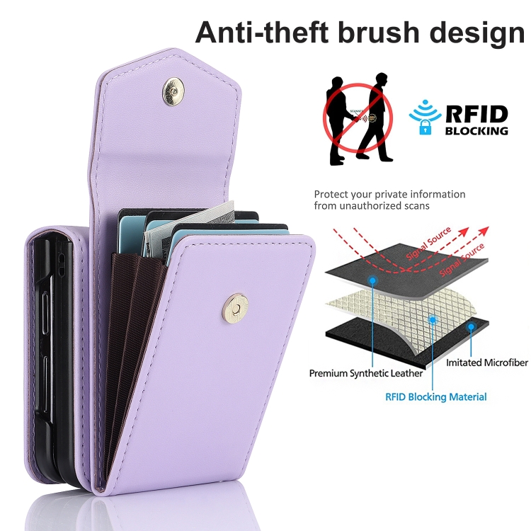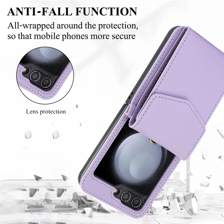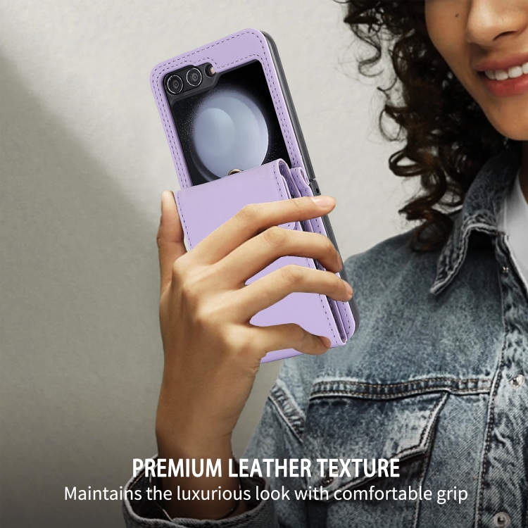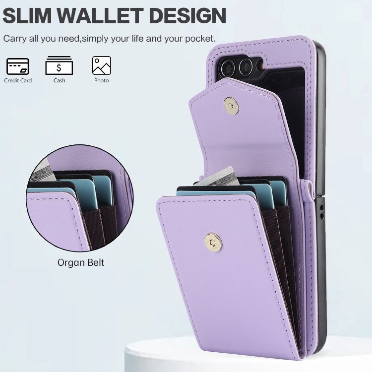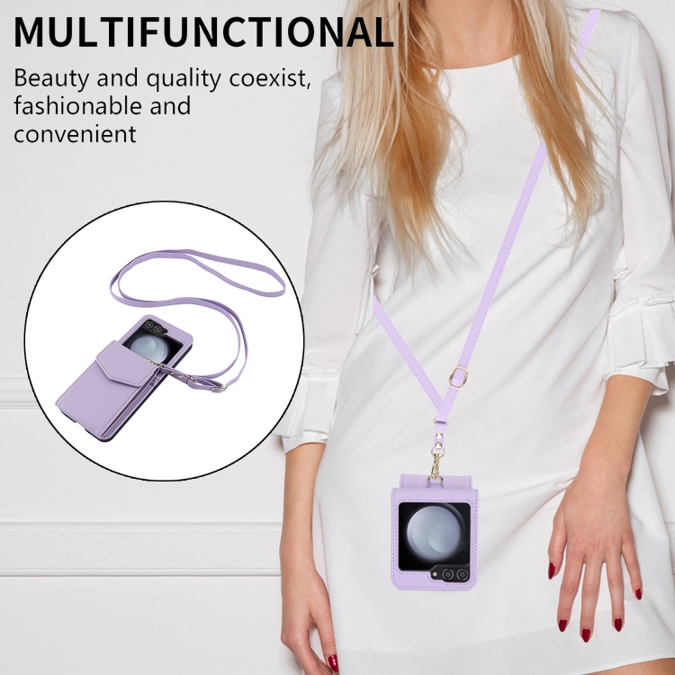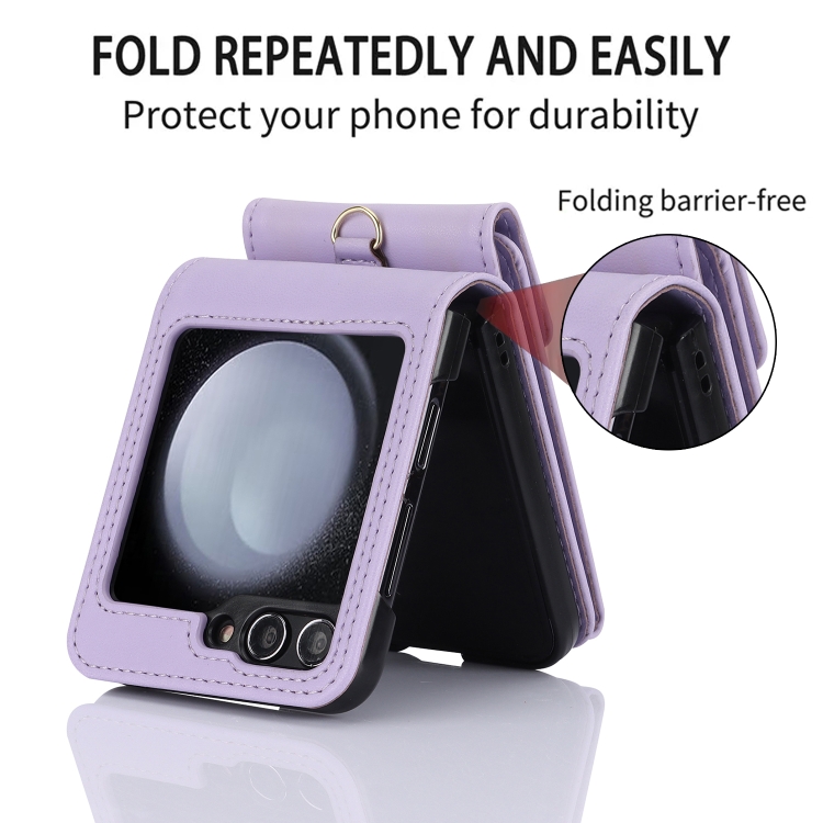 Estuche plegable para teléfono Samsung Galaxy Z Flip5 con RFID, ranuras para tarjetas y cordón largo (Púrpura Claro)
