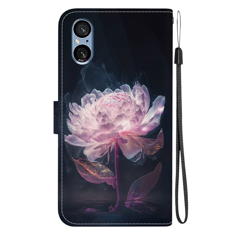 Funda de Cuero para Sony Xperia 5 V con Dibujo Coloreado y Textura de Cristal (Peonía Púrpura)