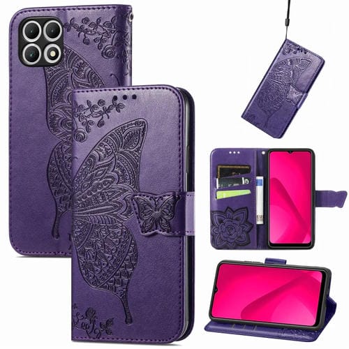 Funda para T-Mobile T Phone 2 5G de Cuero con Relieve Flor de Amor y Mariposa (Púrpura)