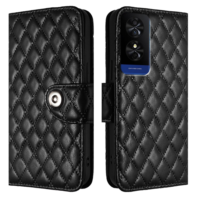 Funda para Teléfono TCL 50 5G de Cuero con Tapa Textura Romboidal y Cordón (Negro)