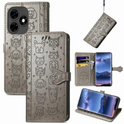 Funda para Tecno Itel S23 de Cuero con Relieve de Perro y Gato (Gris)