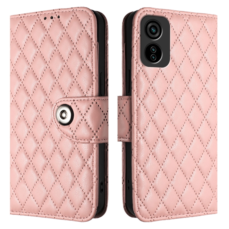 Funda de Cuero para Tecno Pop 6C y Itel A18 con Tapa, Textura Romboidal y Cordón (Rosa Coral)