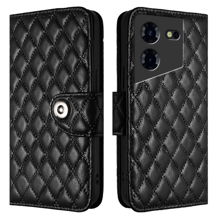 Funda de Cuero para Tecno Pova 5 Pro 5G con Tapa Textura Romboidal y Cordón (Negro)
