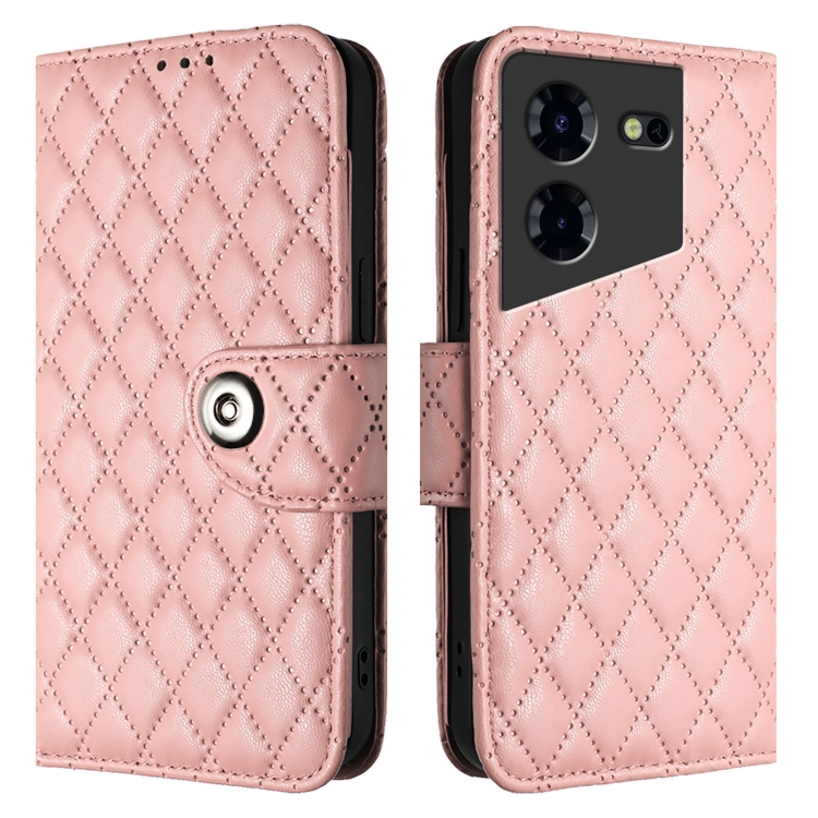 Funda para Tecno Pova 5 Pro 5G con Tapa de Cuero Textura Romboidal y Cordón (Rosa Coral)