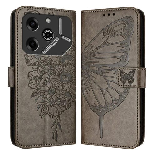 Funda de Cuero para Tecno Pova 6 5G con Mariposa en Relieve (Gris)