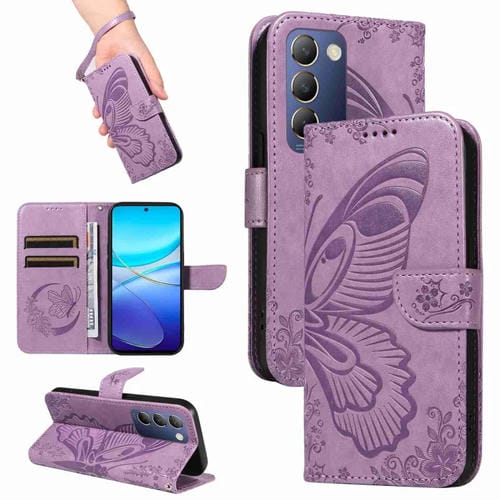 Para Vivo V40 Se 5G / Y100 Idn / Y200E Funda para Teléfono de Cuero con Relieve de Mariposa de Cola de Golondrina (Púrpura)