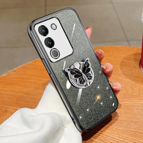 Para Vivo Y200 Global / V29E Estuche para Teléfono de TPU con Soporte de Mariposa con Brillo Degradado Plateado (Negro)