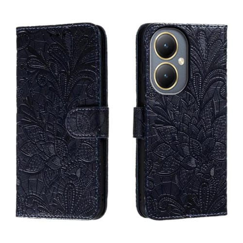 Para Vivo Y35M + Funda para Teléfono de Cuero con Tapa y Estampado de Flores de Encaje (Azul Oscuro)