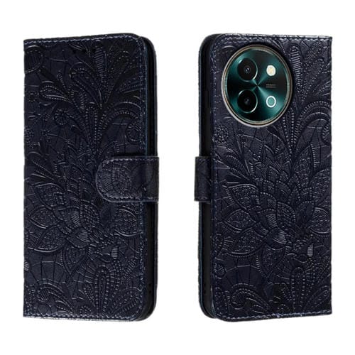 Para Vivo Y38 Funda para Teléfono de Cuero con Tapa y Estampado de Flores de Encaje (Azul Oscuro)
