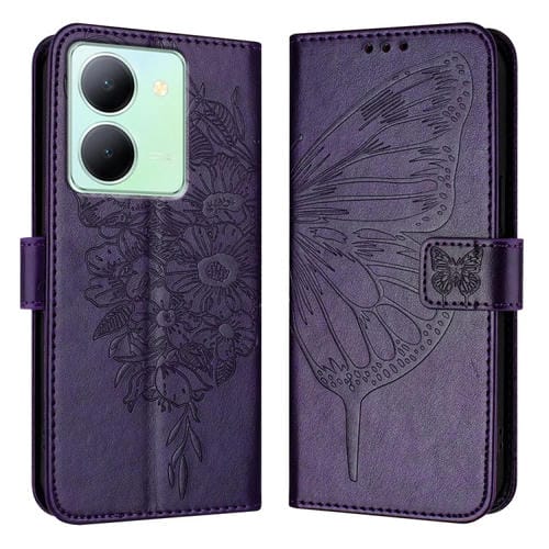 Para Vivo Y78 5G/Y78 + 5G Global/V29 Lite Funda para Teléfono de Cuero con Mariposa En Relieve (Púrpura Oscuro)