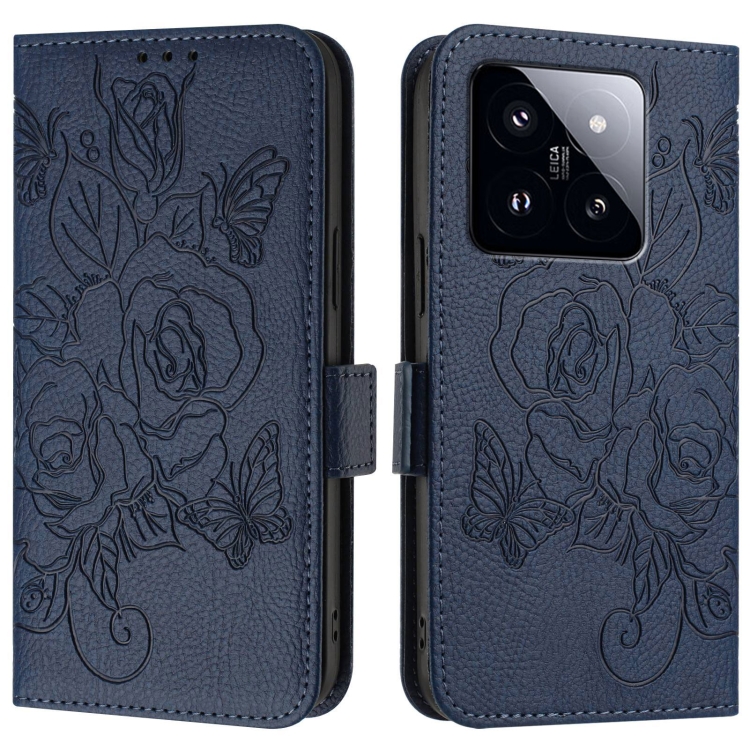 Para Xiaomi 14 Pro 5G Funda De Teléfono De Cuero Antirrobo Rfid Con Relieve Rosa (Azul Oscuro)