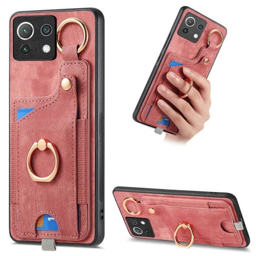 Para Xiaomi Mi 11 Lite Funda para Teléfono con Bolsa para Tarjeta con Anillo y Sensación de Piel Retro con Lazo para Colgar (Rosa)
