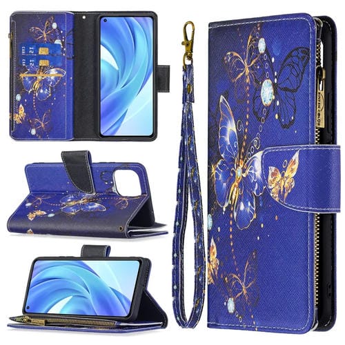 Para Xiaomi Mi 11 Lite Patrón de Dibujo de Color Cremallera con Cremallera Caja de Cuero con Soporte y Ranuras para Tarjetas y Billetera (Mariposa Púrpura)