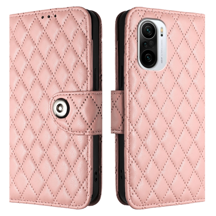 Para Xiaomi Poco F3 Funda para Teléfono con Tapa de Cuero con Textura Rómbica y Cordón (Rosa Coral)