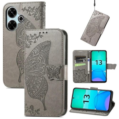 Para Xiaomi Redmi 13 4G Butterfly Love Flower Funda de Cuero para Teléfono En Relieve (Gris)