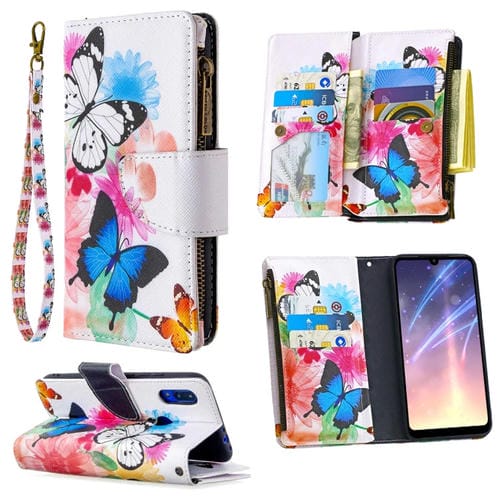 Para Xiaomi Redmi 7 Patrón de Dibujo de Colores Cremallera Funda de Cuero con Tapa Horizontal con Soporte, Ranuras para Tarjetas y Billetera (Dos Mariposas)
