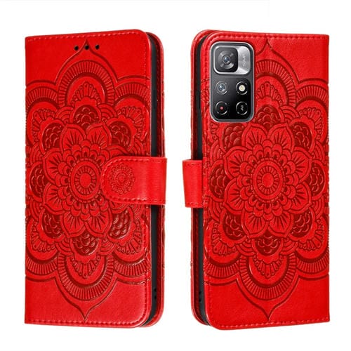 Para Xiaomi Redmi Note 11 Sun Mandala Patrón de Estampado de Estampado de Estampado de Patrón con Titular y Ranuras para Tarjetas y Billetera y Cordón (Rojo)