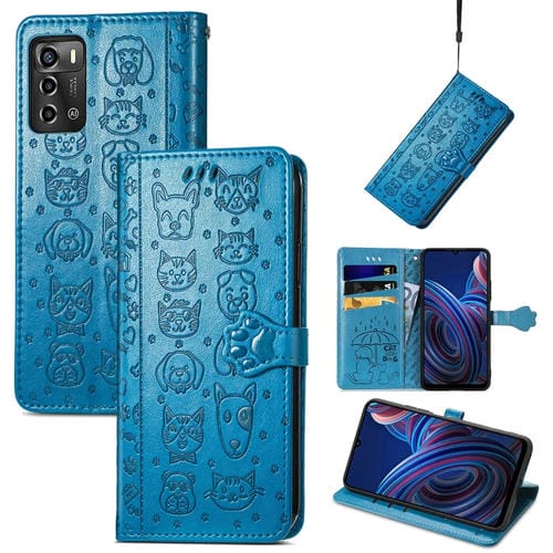 Estuche de Cuero en Relieve para ZTE Blade A72 4G con Diseño Cute Cat and Dog (Azul)