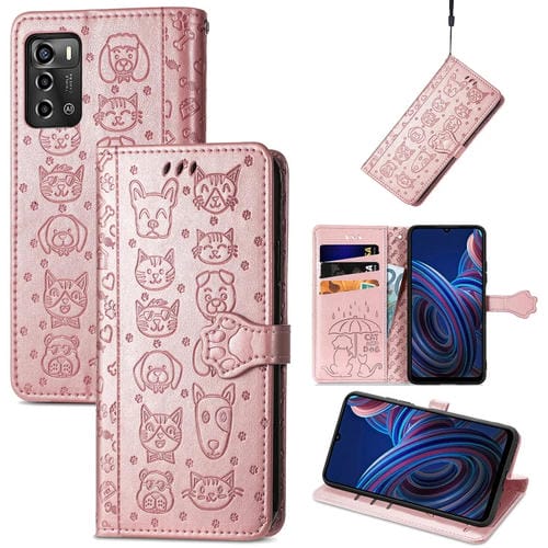 Funda para ZTE Blade A72 4G Estuche de Cuero En Relieve Cute Cat and Dog (Oro Rosa)