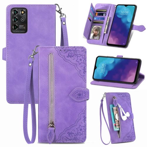 Estuche para ZTE Blade V30 Vita de Cuero con Cremallera y Flor en Relieve (Púrpura)
